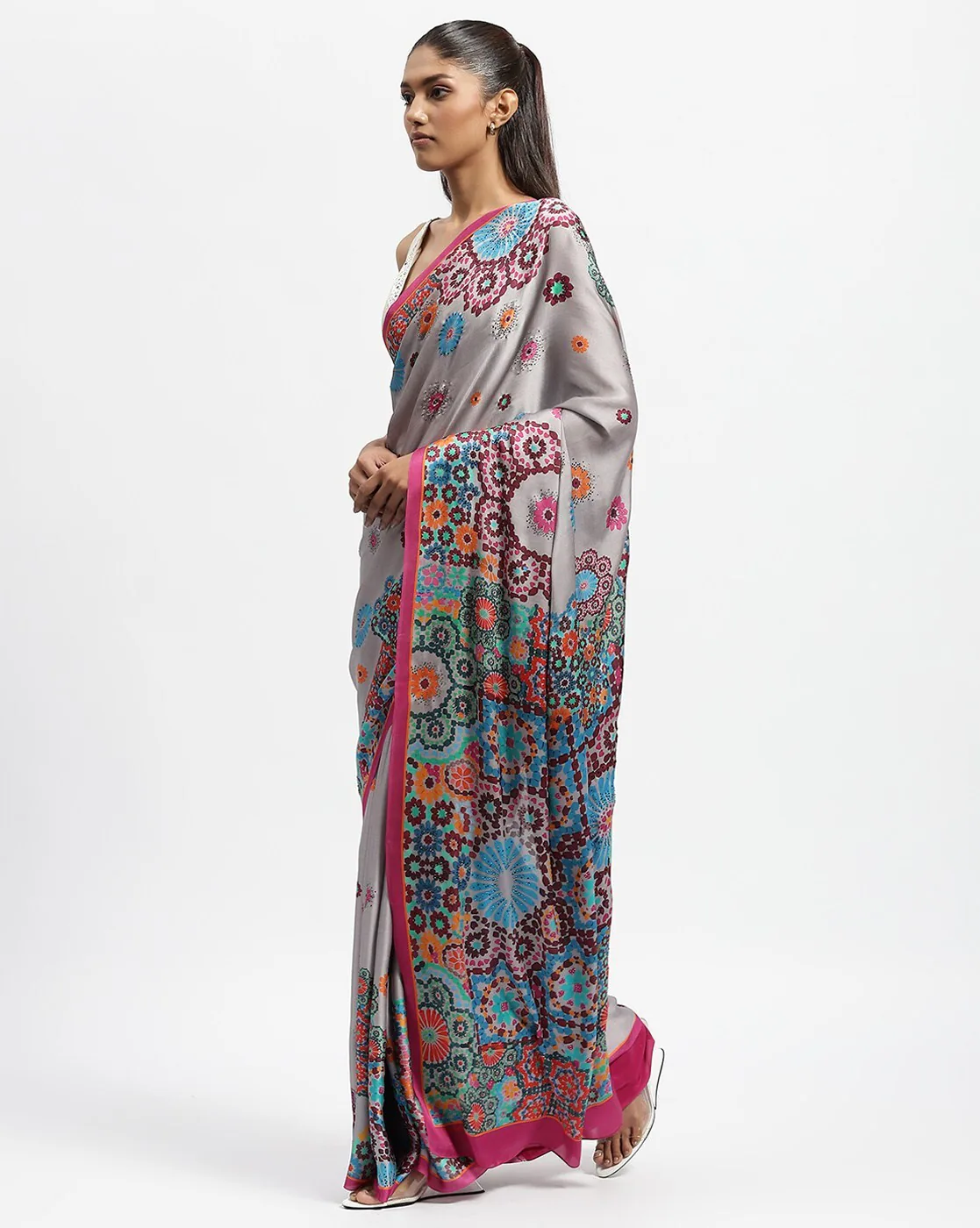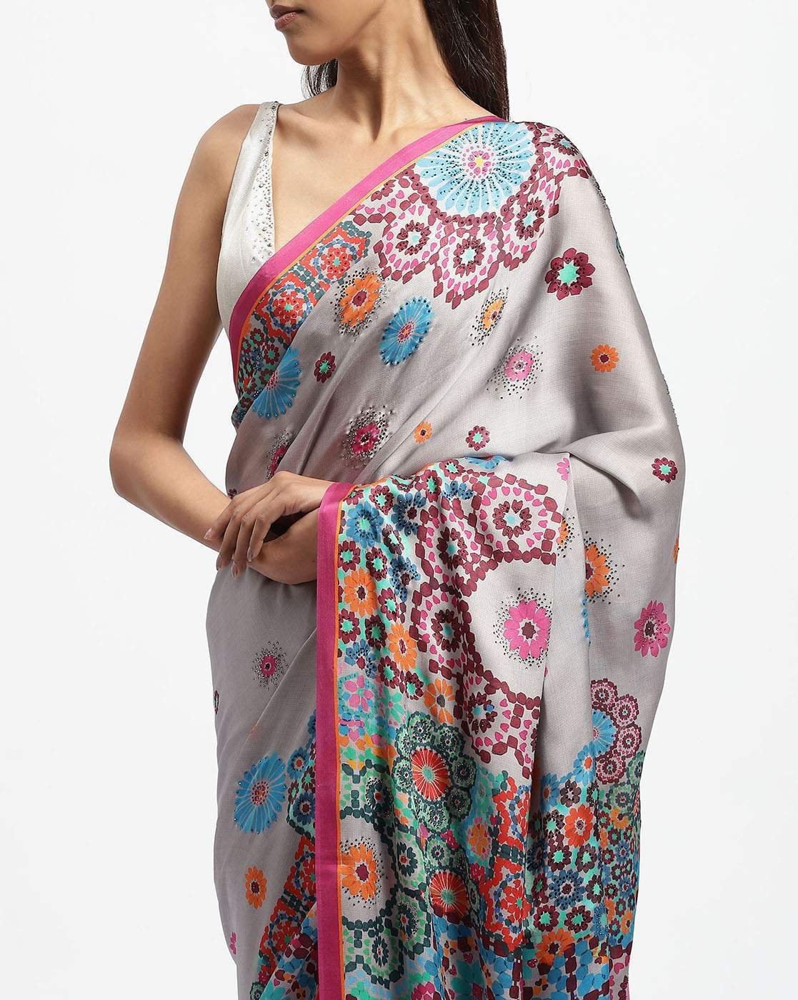 - Flowers bloom in a geometric mosaic on this silk satin saree embroidered with crystals. Ideal for shaping minds.